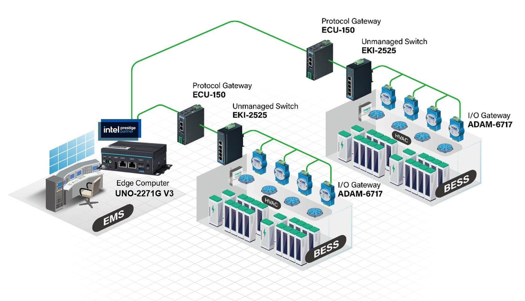 To coordinate multiple racks, ECU-150 edge gateways are deployed to manage communication and device operations within each battery bank and aggregate data for transmission to the UNO-2271G V3.